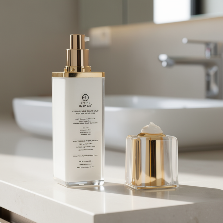Hyaluronic Acid, Aloe Vera, Antioxidant Blend and Biodegradable Jojoba Beads and a blend of antioxidants. This luxurious Aloe based Liquid Gel provides gentle yet thorough cleansing for All Skin Types. This Perfect Gentle Facial Scrub provides a triple action: cleanser, makeup remover and a face wash. Each ingredient is chosen with care and purpose. The combination of the ingredients regenerates and moisturizes and cleans the skin and promotes an all around moisturized and skin calming experience. Use this before application of your morning and night routine.